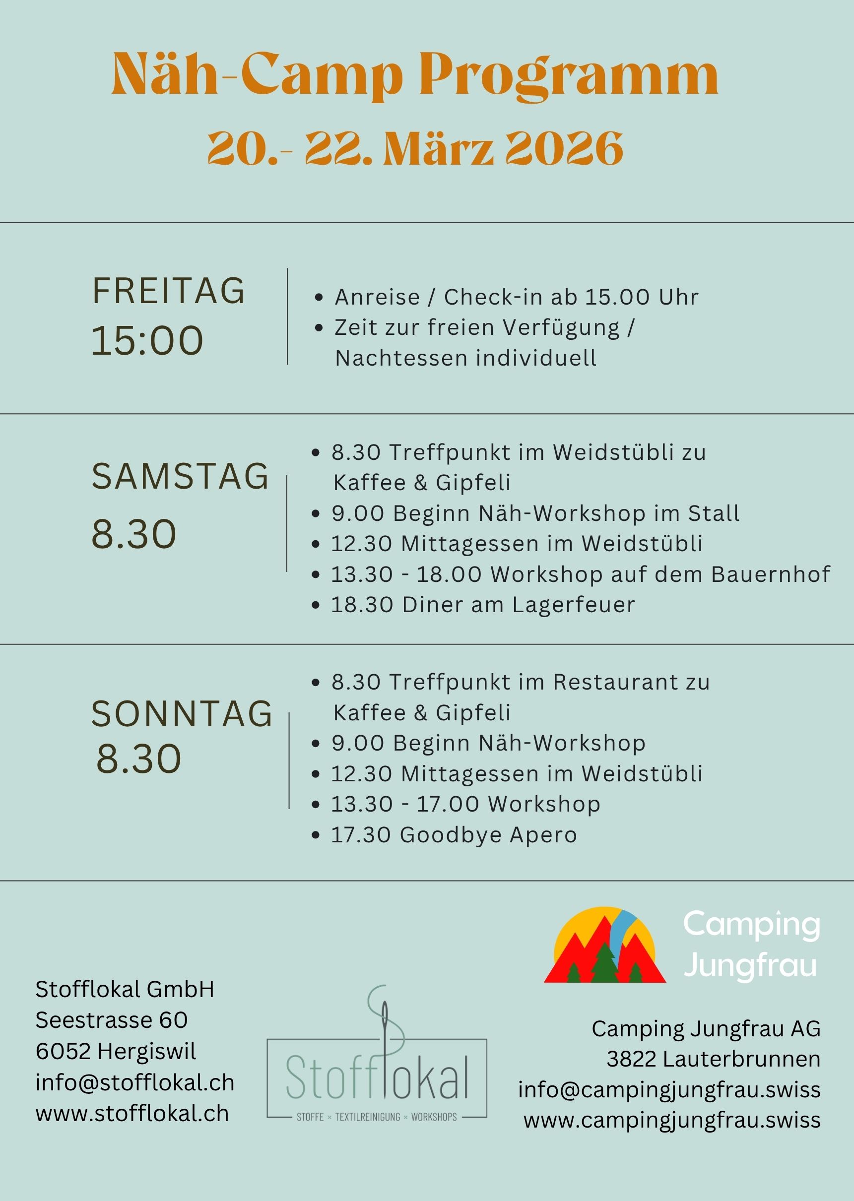 Nähen am Fusse des wohl bekanntesten Wasserfalls in der Schweiz - eingebettet in herrlichstem Bergpanorama - das ist das Näh-Camp in Lauterbrunnen auf dem wunderschönen Camping Jungfrau. Ist das nicht eine wunderbare Vorstellung? Diese kreative Auszeit unter Gleichgesinnten kannst du dir gönnen. Entfliehe für zwei Tage dem Alltag und widme dich ohne Trubel und Stress dem schönsten Hobby der Welt. Auf dem Camping Jungfrau in Lauterbrunnen erfüllen wir dir diesen Wunsch.