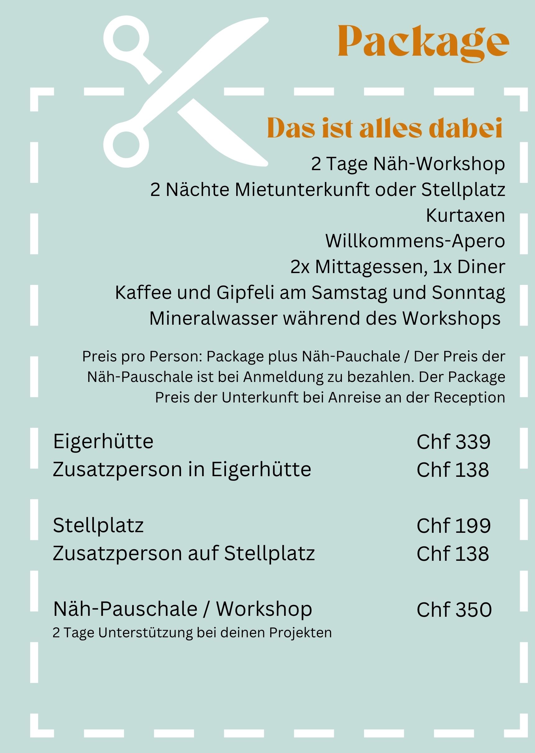 WICHTIG: Der Betrag von CHF 350.00 ist der Betrag für den 2-Tages Workshop. Die Pauschal-Kosten für die Unterkunft, Essen kommen, gem. Preisliste, separat dazu und werden vor Ort direkt beim Camping bezahlt.