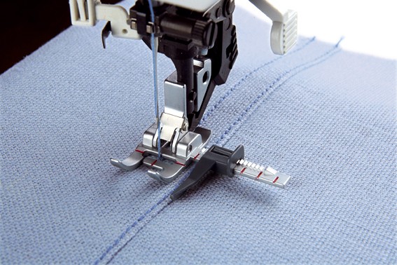 Der Nähfuß mit variabler Führung für IDT™-System sorgt für die perfekte Führung beim Absteppen und dekorativen Nähen. Dieser Nähfuß ist mit einem 'Lineal“ mit verstellbarer Führungslinie ausgestattet, die Sie nach Belieben ausrichten können. Legen Sie die Führung an eine bereits genähte Naht oder an eine beliebige Kante an, um diese wunderschön abzusteppen. Verwenden Sie sowohl Gerad- als auch Zierstiche, auch beim Quilten ist dieser Nähfuß perfekt.