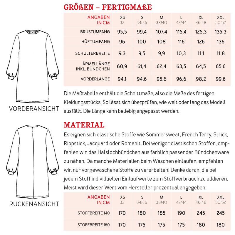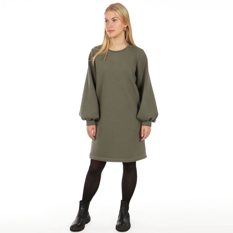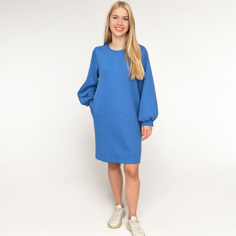 Frau LINN ist ein gerade geschnittenes Sweatkleid mit Rundhalsausschnitt und Taschen in der Seitennaht. Der Saum endet oberhalb des Knies. Die weit ausgestellten Ballonärmel werden am Saum gekräuselt und von Bündchen gefasst. Sie sind der hingucker an diesem sonst schlichten Teil.